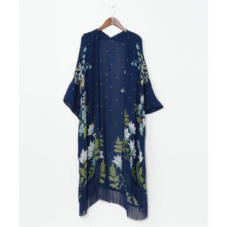 [型番:7IA-5201-2025]軽く手触りの良いレーヨン素材のUVカット羽織。清涼感があり、日差しよけや、夏の冷房対策にピッタリの一枚です。裾にあしらったフリンジが女性らしさをより演出してくれます。UVカット