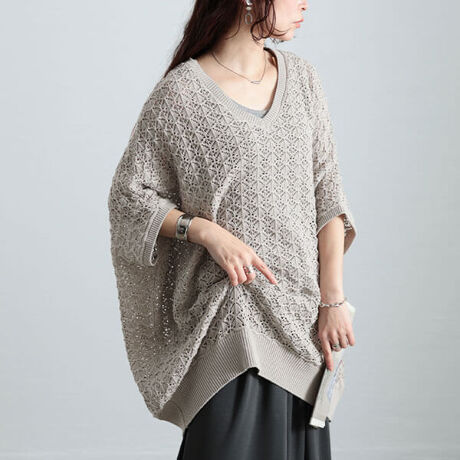 女らしさを醸し出す、透かし編みコットンドルマンチュニック。体型を拾わないゆったり身幅&袖幅のドルマンシルエットでリラクシーなサイズ感でご着用いただけます◎お尻がすっぽり隠れる長め着丈で気になるヒップラインをカバーしてくれるのもオススメのポイントです♪大人カジュアルに取り入れやすいヘルシーな透け感の軽やかなサマーニット綿100%なのでニット特有のチクチクとした肌触りを軽減し、ノンストレスでサマーニットをお楽しみいただけます◎