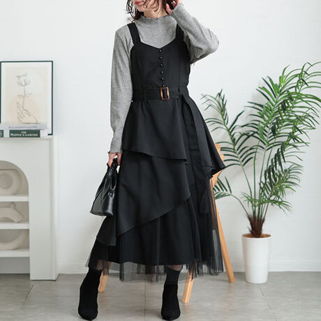 アシンメトリーに配された動きのあるティアードに、軽やかなチュールがドッキングされたワンピース。異素材使いがトレンド感を演出し、ビスチェのようなトップで全体にメリハリをつくります。動く度にふわりと揺れるスカートが愛らしく、都会的な印象を放つ一枚。フロントはすっきりとスタイリッシュさを感じさせながら、背面にたっぷりのシャーリングゴムをデザインすることで、窮屈感のないストレスフリーな着心地に。幅広なベルト付きでメリハリをつくり、高めのウエスト位置で脚長効果にも。