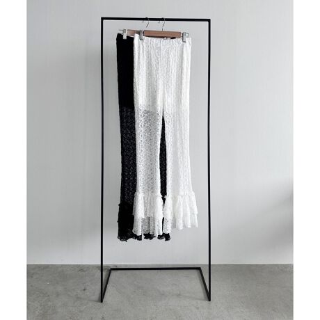 裾部分に2段のフリルが施されたレース素材のフルレングスパンツ。