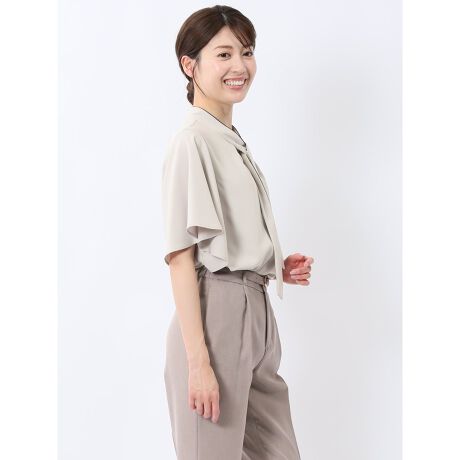 お顔まわりを華やかに演出してくれる、半袖の前開きブラウスです。配色のボウタイ、ボタンの隠れる比翼仕様、二の腕をカバーするフレアスリーブがポイント。キチンと感のあるクリーンなルックスなのでオンオフ兼用で大活躍してくれます。
