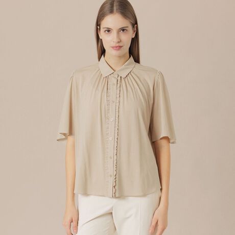 [型番:G5P27571__]【ウォッシャブル】【着用推奨シーズン:春・夏】<素材説明>細番手の綿にナイロンをカバーリングした糸を使用し、程よいハリとシアー感に肌触りの良い風合いが特徴の素材です。<デザインポイント>前衿ぐりと後ヨークにたっぷりギャザーを入れ、繊細なフロントフリルがやさしいテールカットブラウスです。フレアースリーブは前後で丈に差を付け、肘を隠しながら腕が動かしやすいデザインです。