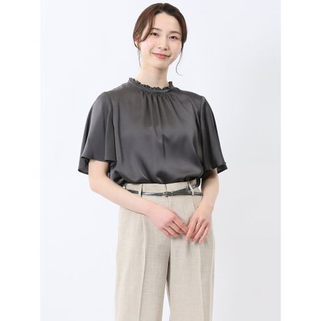 シボサテン ギャザーネック半袖プルオーバーブラウス
