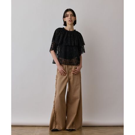 アーバンムードで着こなす、大人フェミニンなケープブラウス。一からオリジナルで作成したGRACCE CONTINENTALらしい、繊細で可憐な刺繍レースを使用。あえて顔回りに密度高めにフラワー柄を入れてコントラストをつけ、華やかに仕上げました。ケープをレイヤードしたような新鮮なデザインを表現した、甘い気分高まるフェミニンなデザインです。ふわんり可愛いシルエットに柔和なエッセンスが溶け込んだセンシュアルな一枚。ワイドパンツやデニムなどのカジュアルなボトムを合わせた、旬なムードのある着こなしをぜひお楽しみください。
