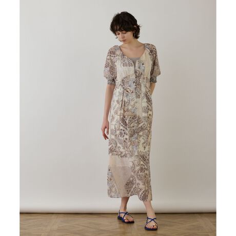 多種のヴィンテージ図案を組み合わせて一から柄を起こした、オリジナルスカーフプリントのワンピース。 柔らかいシフォン素材を使用しデザインも全体的にラフさを出した、今季の GRACE CONTINENTAL の“MELLOW BOHEMIAN”のテーマを感じさせる一枚に仕上げています。胸下で切り替えをいれて程よくシェイプされた女性らしいシルエットは、スタイルアップ効果も◎ウエストベルトを後ろで緩く結ぶことでよりボディラインを美しく見せてくれます。リラックス感のあるラグラン切替えに、シャーリングゴムを入れたふんわりとした袖も特徴。70’sムード漂うパッチワークプリントは、ウエスタンブーツと合わせてBOHO感を出して見せるのも素敵でおすすめ。 真夏の暑い時期に一枚で着て華やかさを演出してくれるアイテムです。