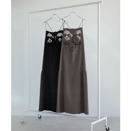 ペイズリーのカットワークレースが目を惹くシックなキャミソールワンピース。縦見えしながら、腰下から切り替えたギャザーフレアでふんわりとフェミニンなAラインに仕上げました。同系色で仕立てたストラップコードはインナーに合わせて調節が可能。プラスワンするだけで落ち着いたレディライクなモードスタイルが完成します。透け感[なし]
