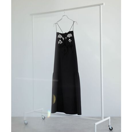 ペイズリーのカットワークレースが目を惹くシックなキャミソールワンピース。縦見えしながら、腰下から切り替えたギャザーフレアでふんわりとフェミニンなAラインに仕上げました。同系色で仕立てたストラップコードはインナーに合わせて調節が可能。プラスワンするだけで落ち着いたレディライクなモードスタイルが完成します。透け感[なし]