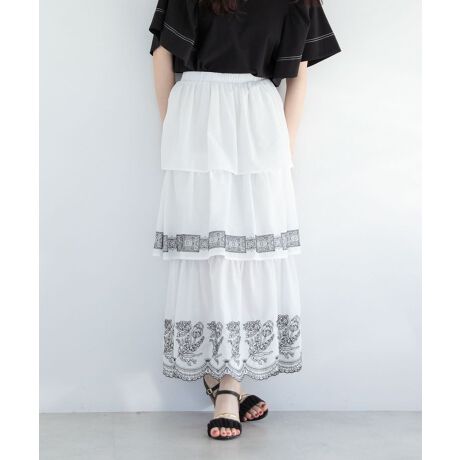 存在感のあるボリュームティアードがポイントのロング丈スカート。ハリのあるナチュラルな生地を使用したふんわりシルエットが魅力的に映えるデザインです。コントラストを魅せるバイカラーの細かな刺繍がお洒落なアクセント。ウエスト総ゴム仕様でフィット感良く、軽い穿き心地なのも嬉しいポイントです。透け感[ややあり]