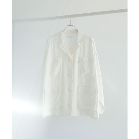 落ち感のあるリネンライクな優しいテキスタイルで仕立たデザインジャケット。ラフなオーバーシルエットでワークテイストなアウトポケットを配したトレンド感あるお作りです。薄手でさらっと羽織れる軽やかさも嬉しいポイント。程よくきちんと感もありつつ、カジュアルなニュアンスともマッチする汎用性の高いアイテムです。透け感[ややあり]