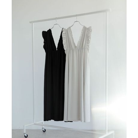 たっぷり施したフリルギャザーがポイントのデザインワンピース。トップ部分をVカットですっきりと仕上げたスリーブレスのフェミニンなお作りです。ハイウエストで切り替えた落ち感あるドレープフレアでメリハリのあるシルエットに。インナー次第で印象を変え、様々なシーンで合わせていただける使い勝手の良いアイテムです。透け感[ややあり]