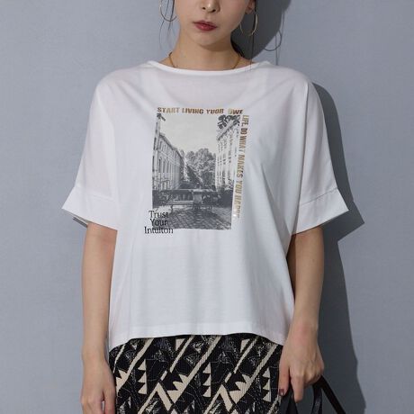 コーディネートになじみやすいフォトデザイン×箔ロゴプリントの上品な大人デザインTシャツ。
