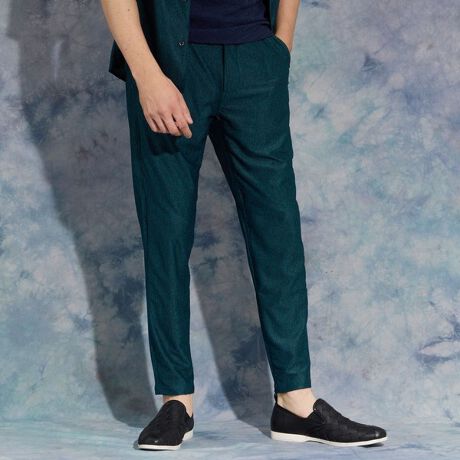 ウエストベルトには平ゴムとスピンドルを通していますのでサイズ調整しやすく、少しお尻廻りから渡りにかけてゆとりのあるサイズ感にしています。その渡りから裾口にかけてテーパードした綺麗なシルエットです。