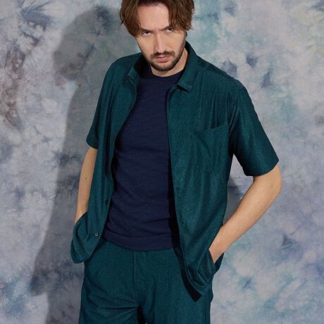 ショートレギュラーカラーの半袖シャツ。素材感を活かしたシンプルなデザインにしています。衿先にワイヤーを入れて衿の形状を綺麗に保てるようにしております。同素材でパンツ「メーカー品番5265-5108」を展開しておりますので、セットアップでのスタイリングもおすすめです。