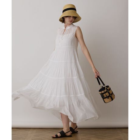 上質な綿シルクローン生地でお作りした、夏にぴったりなマキシ丈のティアードワンピース。発色の綺麗なカラーと用尺をたっぷりとった華やかな蹴回しが、贅沢なボリューム感を放ちます。首元のさりげないフリルテクニックや華奢なリボンなど、可憐なディティールを取り入れてフェミニンムードたっぷりに仕上げました。体から離れるリラックスしたシルエットや優雅な着丈など、カフタンならではの雰囲気はそのままに、ほっこりし過ぎない女性らしく纏える一枚。そのまま一枚でさらっと着ていただくのはもちろんのこと、ウエストにベルトを巻いたり、かごバッグなどでシーズンらしくまとめたり様々な着こなしをぜひお楽しみください。この夏の主力になること間違いなしのワンピースです。