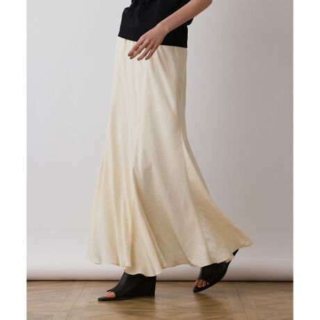 【Japan Fabric】 マーメイドシルエットで魅せる、大人のロングスカート。ジャパンファブリックならではのしなやかでシルキーなサテン素材を使用。すっきりとした腰周りに、裾に向かって用尺をたっぷりとった優雅なマーメイドシルエットがポイントです。ウエストゴム仕様のリラックスした穿き心地でありながら、きちんと見えも叶えた女性らしさ溢れる一枚。動いた時の美しい揺らぎが綺麗で、 洗練度の高い装いへと導いてくれます。気楽なのに品もある、大人のニュアンススタイルを楽しめるスカートです。