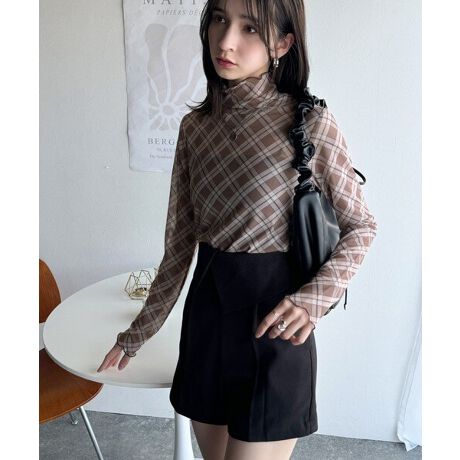 洗練された魅力を引き出す。チェックシアーハイネックメロウトップス(長袖)