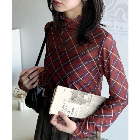 洗練された魅力を引き出す。チェックシアーハイネックメロウトップス(長袖)