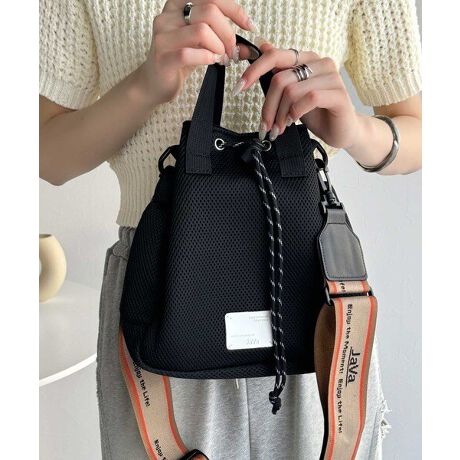 ジャガードロゴテープ使いメッシュ巾着バッグ。