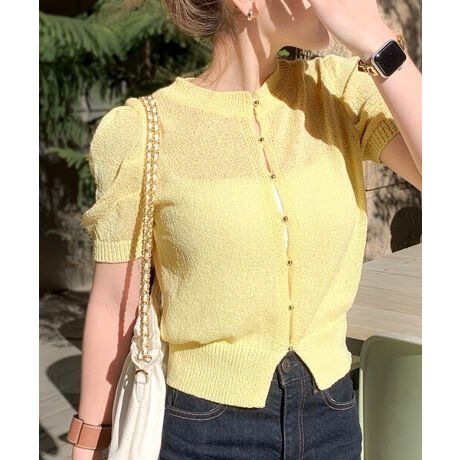可愛いイエローです!ボタンが少し閉めにくいのでブラウスの上にカーディガンとして着ています。タイトなシルエットなのでLで良かったです。