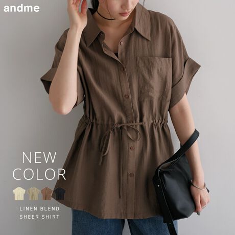 リネン ブレンド ウエスト リボン シアー シャツ ブラウス