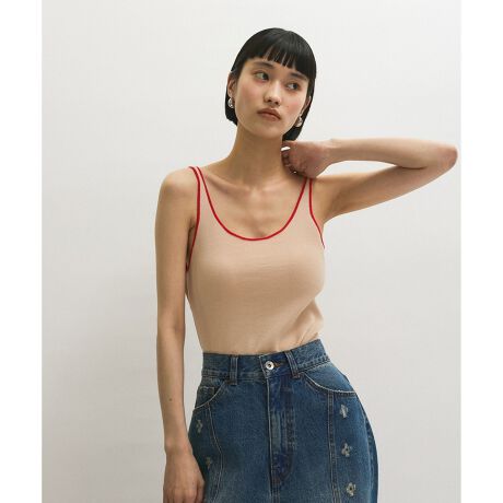 ヘルシーな肌見せスタイルにおすすめのカラーパイピングがポイントのニットタンクトップ。