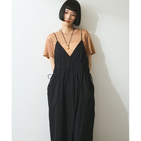ギャザーディティールとカジュアル感のある素材のコントラストもポイントのキャミソールワンピース。