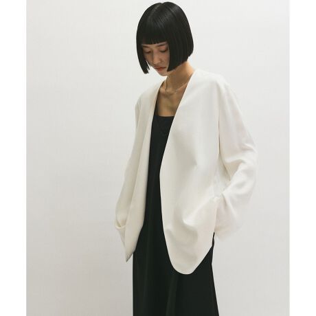 ノーカラーでシームポケット仕様、軽い背裏と袖裏で極力デザインを省いたミニマルなジャケット。