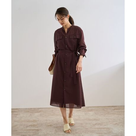 バンドカラーとサファリポケットがアクセントになっています。共地のベルトをして女性らしいシルエットを演出したり、フロント部分を開けて、羽織感覚でスタイリングを楽しめる1着になっています。
