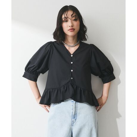 袖のタックや太めのカフス、裾のフリルが華やかなコンパクトなブラウス。