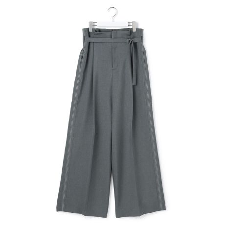 ■デザインサイズレスで使えるきれいめなイージーワイドパンツです。いろんなサイズの方に着用していただけるように、ウエストはベルトで固定する仕様にしています。脇にはジャケット、スカートと共通のシームデザインを取り入れ、セットで着たときに統一感が出るようにデザインしました。また、共地のベルトと配色ベルトを付けることで、着方のバリエーションを増やしています。きれいめに着用する際は共地ベルト、デザインパンツとして着用するなら配色ベルトがおすすめです。通常よりも長めの丈感や、足が長く見えるようスタイルアップを意識したデザインもポイントです。※ミディアムグレー(004)は新色です。