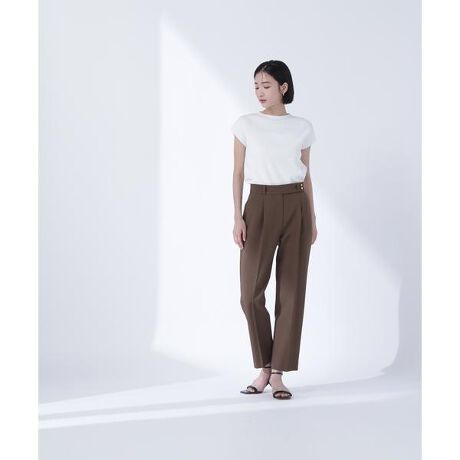裾に向かって細くなるベーシックなテーパードシルエットです。ベルト先にはゴールドカラーの釦を効かせ、トップスインした時のポイントに。きちんと見えするデザインは、ONにもOFFスタイルにも活躍します。<素材>テーパードシルエットがシャープに決まるツイル目で少しハリのある素材を使用。<詳細>仕様・前ファスナー&ボタン裏地・なし透け感・なし / 光沢・なし / 伸縮性・なし生地の厚さ・普通※モデルの着用画像の場合、光の当たり具合により、実際の色味と異なって見えることがございます。色味は、商品単体の画像をご参照ください。