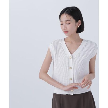 コロンとしたゴールドカラーの釦が今年らしいポイントのニットベスト。夏は1枚でノースリーブとして着たり、インナーをレイヤードすれば長く着ていただけます。キレイめなボトムスやカジュアルなデニムパンツにも着回せるデザイン。今年はモノトーンMIXカラーが新鮮でおすすめです。<素材>コットンタッチな糸で畦編みした少し肉感ある編地です。<詳細>仕様・前ボタン裏地・なし透け感・なし / 光沢・なし / 伸縮性・あり 生地の厚さ・普通※モデルの着用画像の場合、光の当たり具合により、実際の色味と異なって見えることがございます。色味は、商品単体の画像をご参照ください。