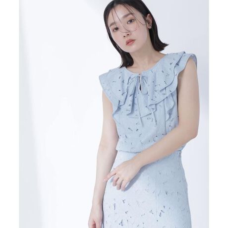 同素材のスカートを合わせるとワンピースのように着こなせるブラウスです。上品な印象のレースはお出かけシーンにもぴったりで、華奢なリボンがさりげないポイント。デニムを合わせてカジュアルダウンするのもオススメです。<素材>柔らかくフェミニンな印象のレースを使用しています。<詳細>仕様・前リボン裏地・あり透け感・なし / 光沢・なし / 伸縮性・なし生地の厚さ・普通<シリーズ>■スカート[品番:0175120550]※モデルの着用画像の場合、光の当たり具合により、実際の色味と異なって見えることがございます。色味は、商品単体の画像をご参照ください。