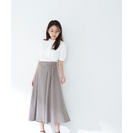 メタルバックルをポイントに効かせた、ベルテッドディテールがポイントのフレアスカート。続きのハイウエストデザインでウエストマークしながら、後ろウエストはゴム仕様のため、ストレフリーな着心地です。タックフレアを入れたシルエットは、オフィスシーンにもぴったりで、ブラウスやキレイめニットにも相性よく着ていただけます。便利なスラッシュポケット付き。<素材>キレイな表面感の合繊素材を使用。体のラインを拾いにくい程よい肉感です。ネイビーは無地、グレーとブラウンは糸色を配色したミックス調の見え方もポイントです。<詳細>仕様・後ろファスナー裏地・あり透け感・なし / 光沢・なし / 伸縮性・なし 生地の厚さ・普通※モデルの着用画像の場合、光の当たり具合により、実際の色味と異なって見えることがございます。色味は、商品単体の画像をご参照ください。