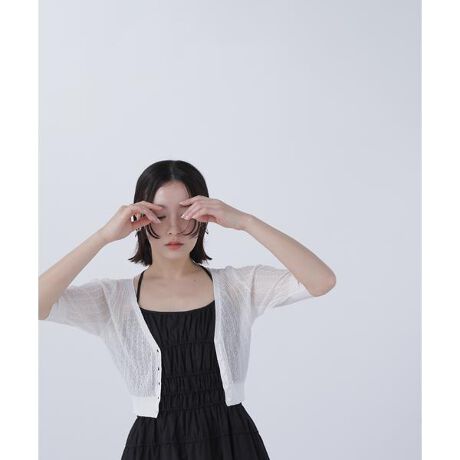 <BLANC(ブラン)>今のほしいをここに。自分らしく、自由なスタイリングを楽しみたい。洗練されたCLASS感と“今”を感じるモードフェミニンなアイテムを提案します。カラーが映えるショート丈のニットカーディガン。リブとレース柄を組み合わせた編地が涼しげな印象に見せてくれます。ノースリーブやキャミワンピースの羽織にぴったりなデザインです。<素材>ハイゲージの華奢な糸を使用しています。<詳細>仕様・前ボタン裏地・なし透け感・あり / 光沢・なし / 伸縮性・あり生地の厚さ・薄手※モデルの着用画像の場合、光の当たり具合により、実際の色味と異なって見えることがございます。色味は、商品単体の画像をご参照ください。