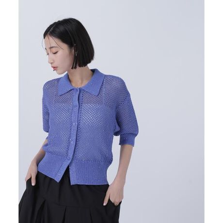 スパンコールの糸を引き揃えてメッシュ編みで仕上げたポロ襟ニット。スパンコール糸を使うことで華やかさとこなれ感を加えながら、メッシュ編みでヘルシーな肌見せが叶い、抜け感のある印象に。トレンドのポロ襟デザインが今っぽい雰囲気に見せてくれます。袖のフォルム感や丈感で、カジュアルさもありながら、大人っぽいスタイリングに見えるようバランスに拘ったデザインです。<素材>プレーンな糸とスパンコール混の糸を引き揃え、ほんのり配色の効いたニュアンスのある見え方です。メッシュ編みなので軽く、抜け感のある印象の素材です。<詳細>仕様・前ボタン裏地・なし透け感・あり / 光沢・ややあり / 伸縮性・あり生地の厚さ・普通※モデルの着用画像の場合、光の当たり具合により、実際の色味と異なって見えることがございます。色味は、商品単体の画像をご参照ください。