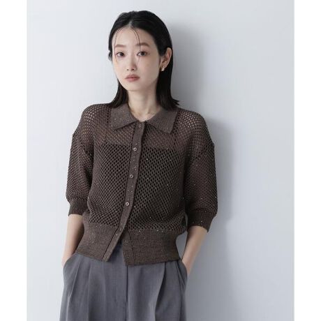 スパンコールの糸を引き揃えてメッシュ編みで仕上げたポロ襟ニット。スパンコール糸を使うことで華やかさとこなれ感を加えながら、メッシュ編みでヘルシーな肌見せが叶い、抜け感のある印象に。トレンドのポロ襟デザインが今っぽい雰囲気に見せてくれます。袖のフォルム感や丈感で、カジュアルさもありながら、大人っぽいスタイリングに見えるようバランスに拘ったデザインです。<素材>プレーンな糸とスパンコール混の糸を引き揃え、ほんのり配色の効いたニュアンスのある見え方です。メッシュ編みなので軽く、抜け感のある印象の素材です。<詳細>仕様・前ボタン裏地・なし透け感・あり / 光沢・ややあり / 伸縮性・あり生地の厚さ・普通※モデルの着用画像の場合、光の当たり具合により、実際の色味と異なって見えることがございます。色味は、商品単体の画像をご参照ください。