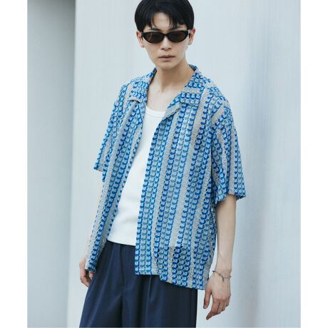 総柄のデザインが魅力のショートスリーブシャツ。独特のレース柄が織り成すアブストラクトなパターンが、シンプルなシャツに個性と華やかさをプラスします。