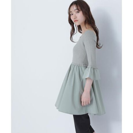 広めなボートネックがすっきりとしたチュニックニットです。袖はフレアスリーブで印象的に見せるデザインにし、布帛部分にタフタを使って軽さと華やかさを演出。ヒップラインまでかかる着丈なので細身パンツを合わせれば、体型カバーが叶います。今年はカプリパンツ合わせがオススメです。<素材>しっかりとした肉感があるツヤのあるタッチのリブニットと、布帛部分はハリ感のあるタフタ素材を使用しています。<詳細>仕様・開閉なし裏地・なし透け感・なし / 光沢・なし / 伸縮性・あり生地の厚さ・普通※モデルの着用画像の場合、光の当たり具合により、実際の色味と異なって見えることがございます。色味は、商品単体の画像をご参照ください。