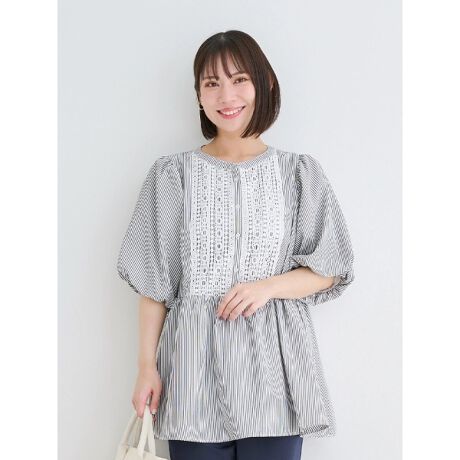 レース切り替えバルーンスリーブチュニック(無地・ストライプ)