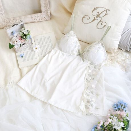 サイドにはお揃いのレースをアシンメトリーに使用して、大胆な透け感とスリットが、キャミソールだけの華やかさを演出。より世界観をお楽しみいただける、お揃いのタップパンツとのコーディネートもおすすめです。