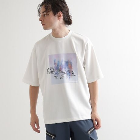 アブストラクトなグラフィックプリントの上にフラワーの刺繍を施し、凝った一枚。
