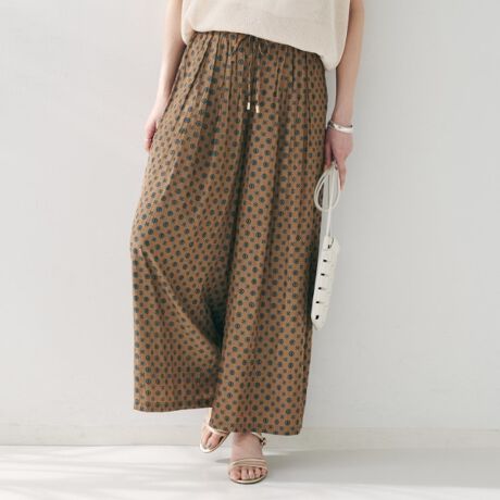 ウエストゴムのイージーパンツなので体にフィットする事なく、エレガントに着られるパンツです。