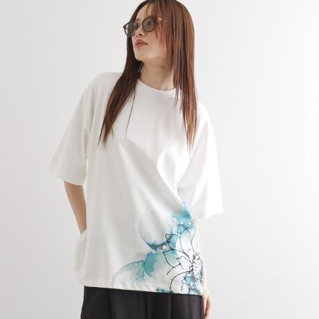 バブルプリントと花柄刺繍を組み合わせた、フロントのグラフィックが目を惹く一枚。