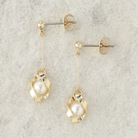動くたびに揺れるメタルとフェイクパールのコンビネーションが、エレガントかつ遊び心を感じさせるデザイン。