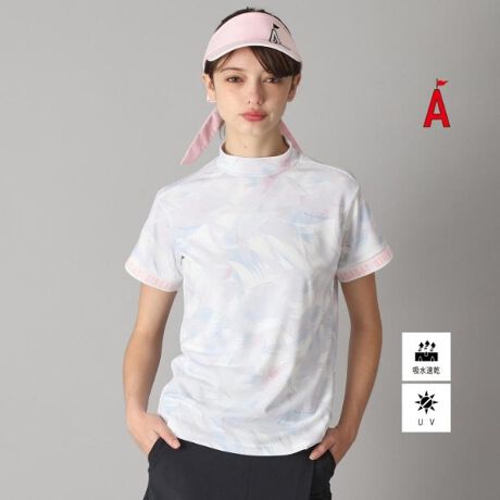 優雅なフェザー柄の総柄デザインが目を惹くレディース半袖プルオーバー。