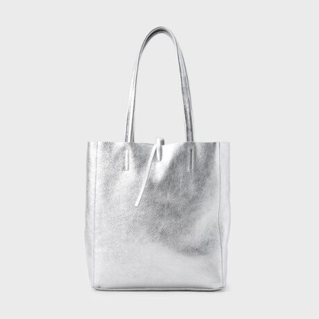 スタイリッシュなメタリックレザートート。
