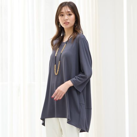 チュニック丈の後ろ下がりのヘムライン。