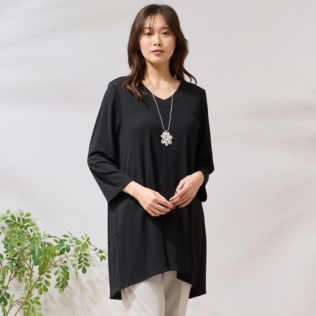 襟ぐりを切り替え、後ろ中心でスリット開きを入れたデザインがさり気なくおしゃれ。