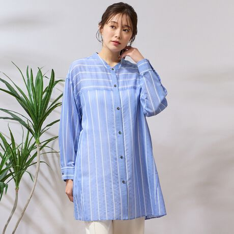 ■ストライプの切り替えで着やせ効果も期待できる、チュニック丈ブラウス■